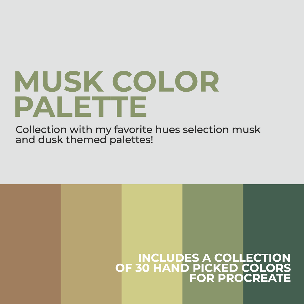 This one is my Procreate Musk Color Palette with 30 Color hues I personally use in my illustration either client work or my own.