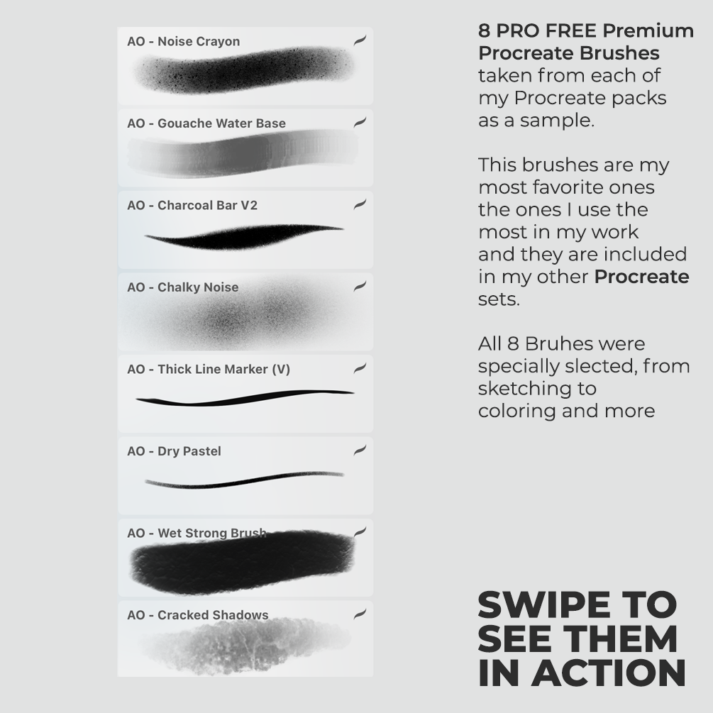 This FREE pack includes a handpicked selection of my favorite brushes from each of my Procreate packs. So you can have an idea of how amazing the brushes in those packs are. This is only 8 FREE BRUSHES from a total of 230 brushes and Procreate tools! check them out.