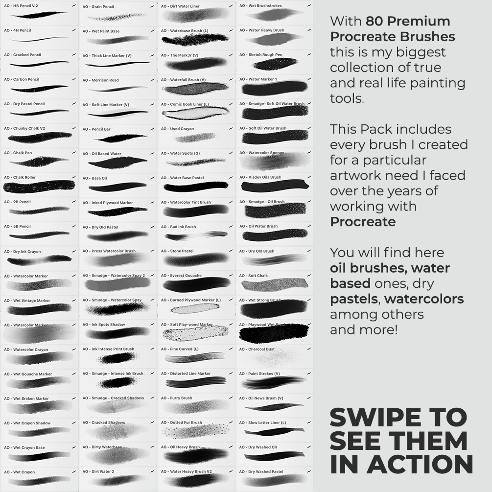 80 Premium Procreate Brushes | Artist's Pack | Technical Pencils Markers Gouache Watercolor Pastels Wet Brushes Water Pencils Oil and more ... | Asia Orlando Brushes